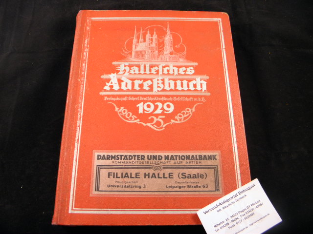 HALLE.– HALLESCHES ADRESSBUCH 1929.– Halle (Scherl), 1929. 4°. XII, 370, 148, 66, 73, 28 S. mit zwischengebundenen Papptiteln. ill. OLdr. kaum gelockert und bestaubt, Stadtplan fehlt. Enthält Namen- und Firmenteil, Straßenteil, Branchen- und Behördenverzeichnis sowie Umgebungsteil.