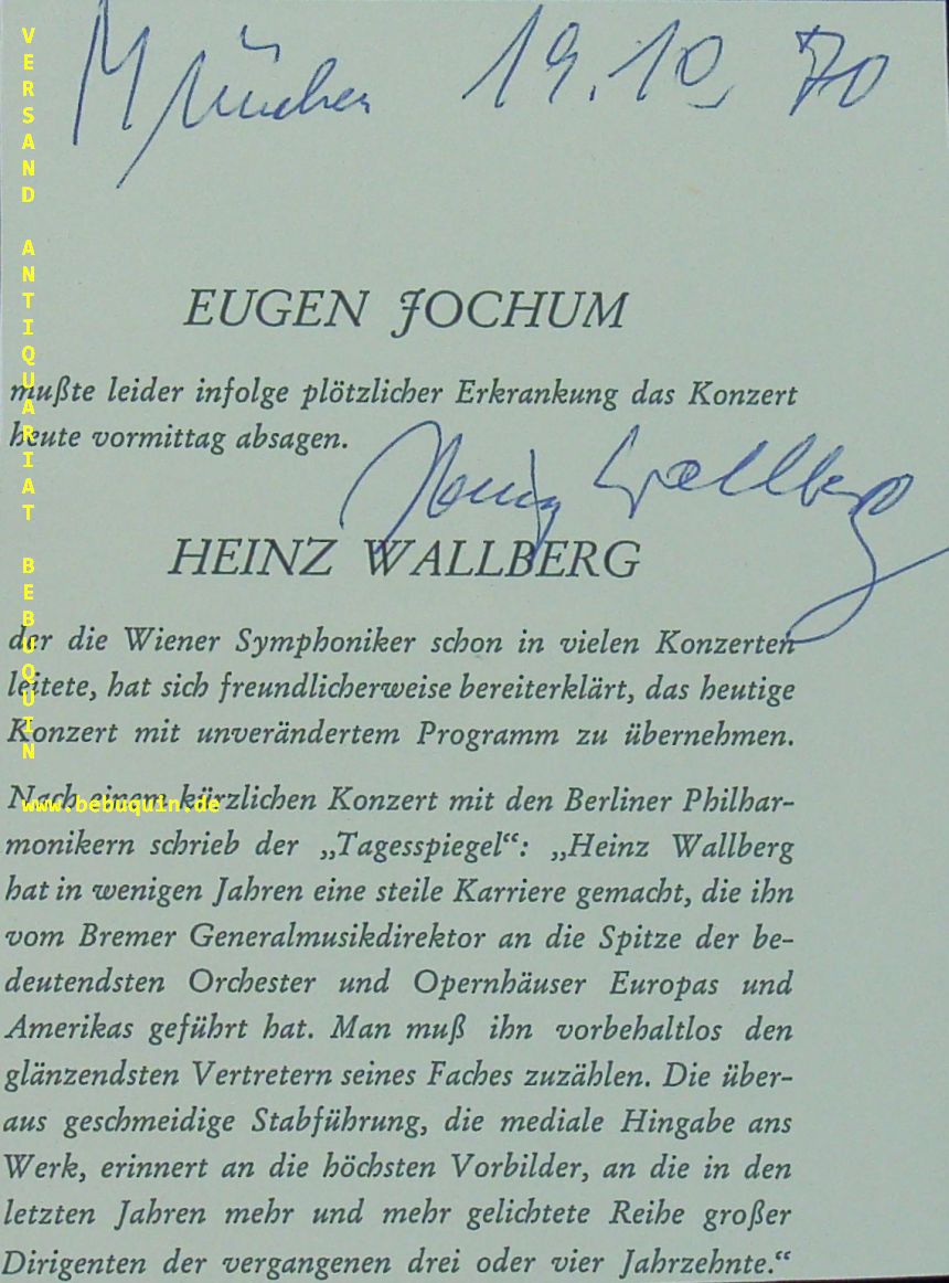 WALLBERG, Heinz (Dirigent): eigenhändige Signatur und Datum in Programmheftausschnitt.. München, 19.10.1970. 15 x 11 cm. 1 Bl. Heinz Wallberg (* 16. März 1923 in Herringen (heute Hamm); † 29. September 2004 in Essen) war ein deutscher Dirigent. (Wikipedia)