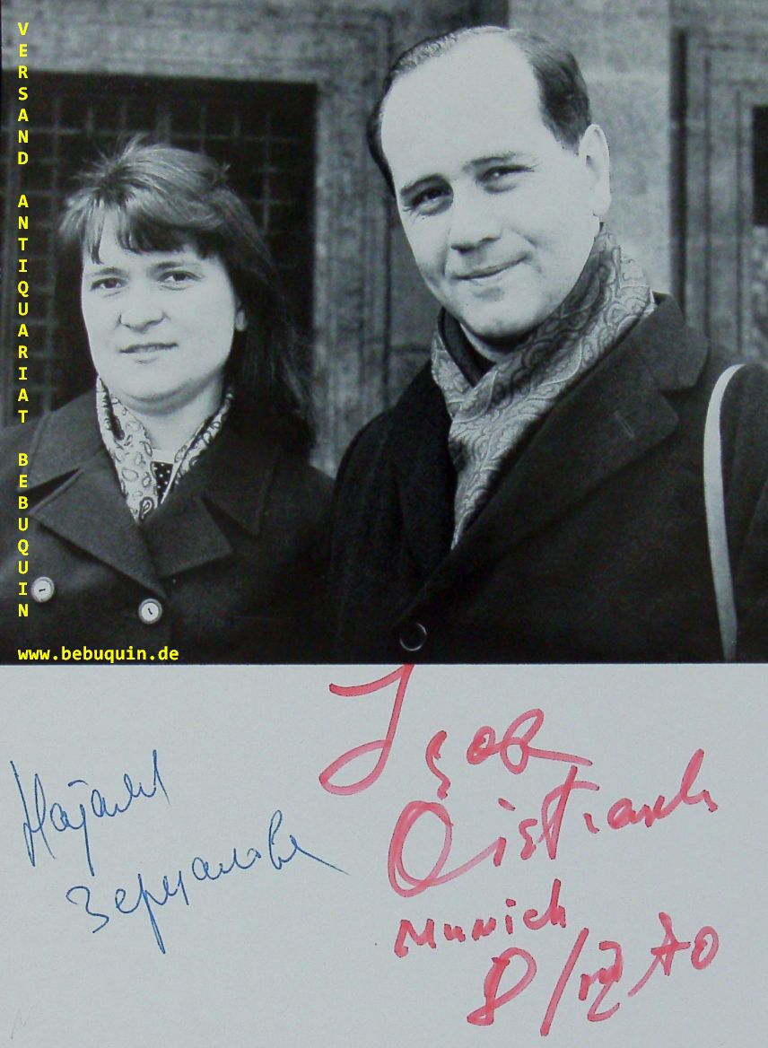 OISTRACH, Igor (Violinist) + SERTSALOVA, Natalia (Pianistin): eigenhändig von beiden signiertes und datiertes Portraitbild. München, 8.2.1970. 19,5 x 14,5 cm. Programmheftauschnitt mit rotem Namenszug. Igor Dawidowitsch Oistrach (* 27. April 1931 in Odessa) ist ein russisch-ukrainischer Geiger. Natalia Sertsalova war seine Partnerin. (Wikipedia)