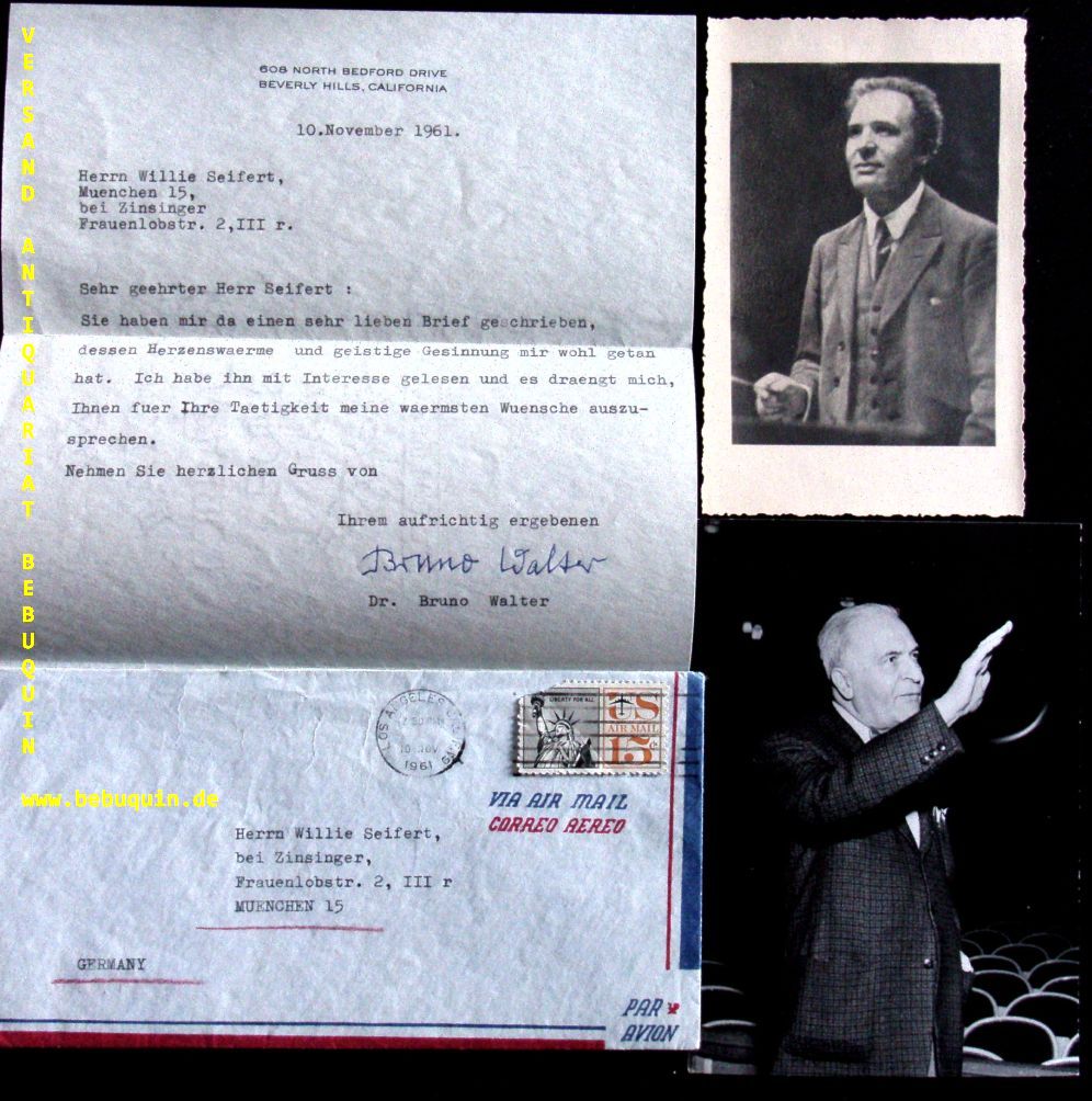 WALTER, Bruno (Dirigent): achtzeiliger ms Brief mit eigenhändiger Unterschrift an Willi Seifert: „Sie haben mir da einen sehr lieben Brief geschrieben, dessen Herzenswärme und geistige Gesinnung mir wohl getan hat.“ Los Angeles 10.11.1961. 20 x 20 cm. 1 Bl. in original gelaufenem Umschlag mit Marke (US Air Mail). Dabei ein Duplikat des Seifert-Briefes sowie 2 alte Fotos von Bruno Walter. tadellos Dieser Brief galt Willi Seifert zeit Lebens als größter Schatz und letztlich als Höhepunkt seiner Sammelleidenschaft. Bruno Walter (* 15. September 1876 in Berlin als Bruno Walter Schlesinger; † 17. Februar 1962 in Beverly Hills, Kalifornien, USA)[1] war ein deutscher Dirigent, Pianist und Komponist mit französischer Staatsbürgerschaft und wurde nach seiner 1939 erfolgten Emigration in die USA 1946 US-amerikanischer Staatsbürger. Er zählt zu den bedeutendsten Dirigenten des 20. Jahrhunderts. Walter war Kapellmeister des Leipziger Gewandhauses (1929–1933), Chefdirigent der New Yorker Philharmoniker (1947–1949) und ständiger Gastdirigent der Wiener Philharmoniker. (Wikipedia)