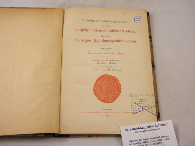 LEIPZIG.– MOLTKE, Siegfried: Urkunden zur Entstehungsgeschichte der ersten Leipziger Grosshandelsvertretung. Der erste Leipziger Handlungsgehilfenverein. Hrsg. von der Handelskammer zu Leipzig. Leipzig (Twietmeyer), 1904. Gr. 8°. CV S. + 6 Bildtafeln. HLn der Zeit. makuliertes Bibliotheksex. seltene EA.