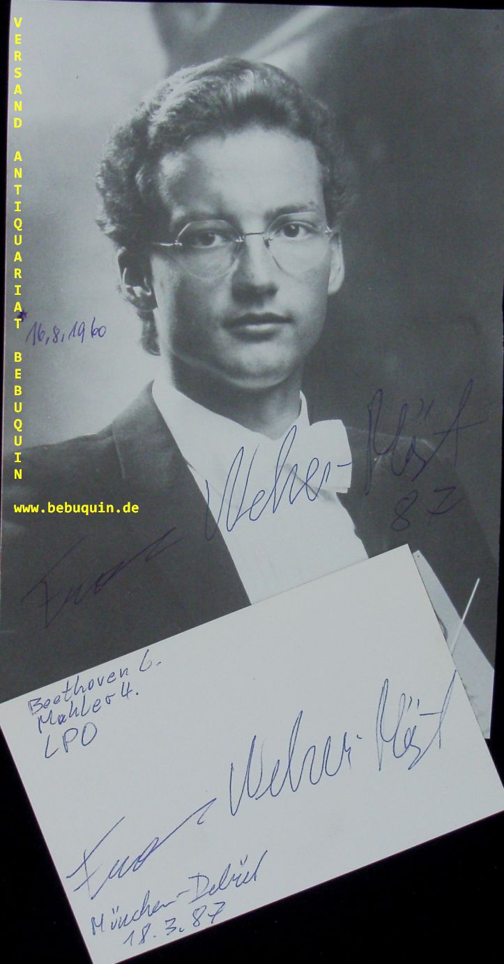 WELSER-MÖST, Franz (Dirigent): eigenhändig signierte und datierte Portraitseite sowie ebenfalls eigenhändig signierte und datierte Autogrammkarte. Am Tag des München-Debüts. München (Philharmonie), 18.3.1987. 21 x 14 + 8 x 10,5 cm. 2 Karteikarten in Programmheft. Darin weitere eigenhändige datierte Signatur auf Portraitbild. feine Stücke. Franz Welser-Möst (eigentlich: Franz Leopold Maria Möst, * 16. August 1960 in Linz, Oberösterreich) ist ein österreichischer Dirigent. Er ist seit 2002 Musikdirektor des Cleveland Orchestra. (Wikipedia)