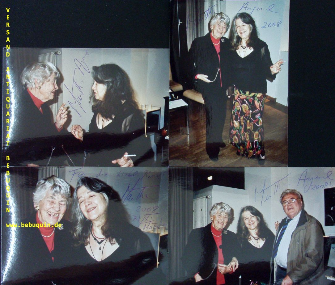ARGERICH, Martha (Pianistin): 4 eigenhändig signierte und datierte Privatfotos. München (Philharmonie), 4.12.2006. 12,5 x 17,5 cm. 4 Farbfotos mit Willi und Rosel Seifert. Martha Argerich (* 5. Juni 1941 in Buenos Aires) ist eine argentinisch-schweizerische Pianistin. Im Jahr 2005 erhielt sie die Auszeichnung Praemium Imperiale, den „Nobelpreis der Künste“. Im Jahr 2014 wurde sie mit dem ECHO Klassik in der Kategorie „Konzerteinspielung des Jahres (Klavier)“ mit dem Orchestra Mozart Bologna unter Claudio Abbado für Mozarts Klavierkonzerte 20 & 25 ausgezeichnet. 2016 erhielt sie den Kennedy-Preis. (Wikipedia)