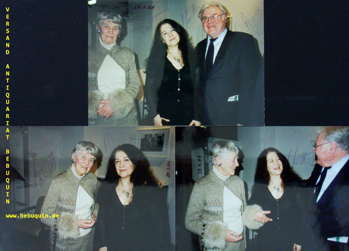 ARGERICH, Martha (Pianistin): 3 eigenhändig signierte und datierte Privatfotos. München (Philharmonie), 20.1.2001. 12,5 x 17,5 cm. 3 Farbfotos mit Willi und Rosel Seifert. Martha Argerich (* 5. Juni 1941 in Buenos Aires) ist eine argentinisch-schweizerische Pianistin. Im Jahr 2005 erhielt sie die Auszeichnung Praemium Imperiale, den „Nobelpreis der Künste“. Im Jahr 2014 wurde sie mit dem ECHO Klassik in der Kategorie „Konzerteinspielung des Jahres (Klavier)“ mit dem Orchestra Mozart Bologna unter Claudio Abbado für Mozarts Klavierkonzerte 20 & 25 ausgezeichnet. 2016 erhielt sie den Kennedy-Preis. (Wikipedia)