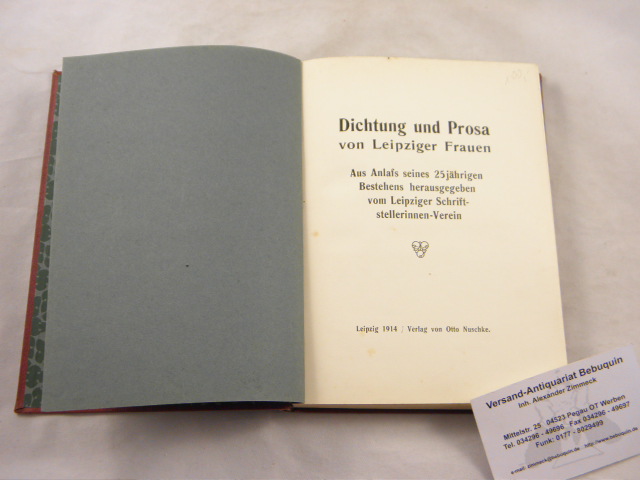 LEIPZIG.– THIELEMANN, Elisabeth: (Hrsg.) Dichtung und Prosa von Leipziger Frauen. Aus Anlass seines 25jährigen Bestehens hrsg. vom Leipziger Schriftstellerinnen-Verein. Leipzig (Nuschke), 1914. 231 S. mit kleinen Miniaturportraitbildern der hier vereinten Schriftstellerinnen. OLn. fein erhalten. sehr seltene EA mit Texten von Marie Böhm, Klara Bucher, Getrud Wittrin, Helene Wagner, Getrud Timmermann, Marte Sorge, Amalie Marie Viktorie Senninger, Eva Schröter, Viola Röthig, Emmy Mentner-Rudolf, Martha Kupfer, Tina Kluge, Emma Flügel u.v.a.
