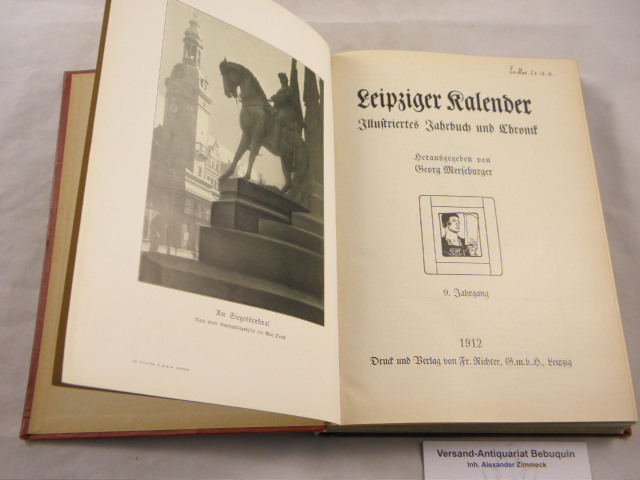 LEIPZIG.– MERSEBURGER, Georg: (Hrsg.) Leipziger Kalender. 09. Jg. Illustriertes Jahrbuch und Chronik. Leipzig (Merseburger), 1912. 307, 76 S. mit zahlr. Abb. + teils gefalteten Bildtafeln. ill. OLn. gut erhalten. EA.