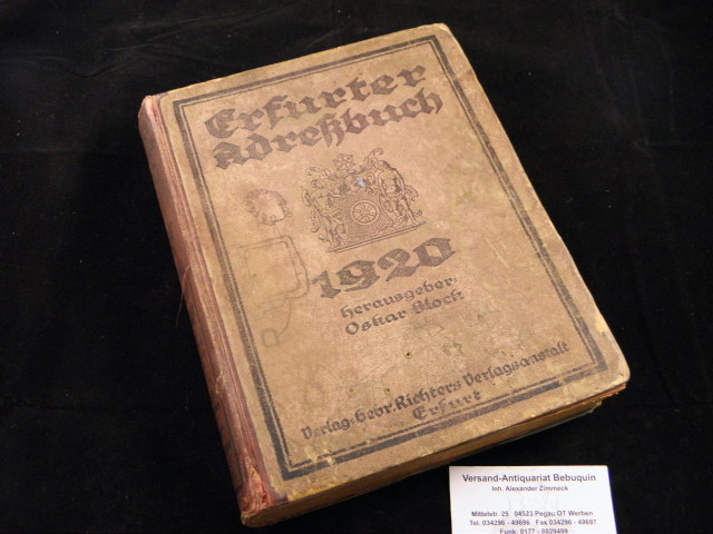 ERFURT.– ADRESSBUCH DER STADT ERFURT MIT HOCHHEIM 1920.– Hrsg. von Oskar Block. Erfurt (Richter), 1920. Gr. 8°. 32, 28, 388, 177, 162 S. und umfangreicher Werbeanhang. OHLn. Einband etwas berieben und angeschmutzt, einige Seiten am Rand mit Tesareparaturen, Gelenke stabilisiert, Stadtplan fehlt, ordentliches Ex. seltenes Adressbuch.