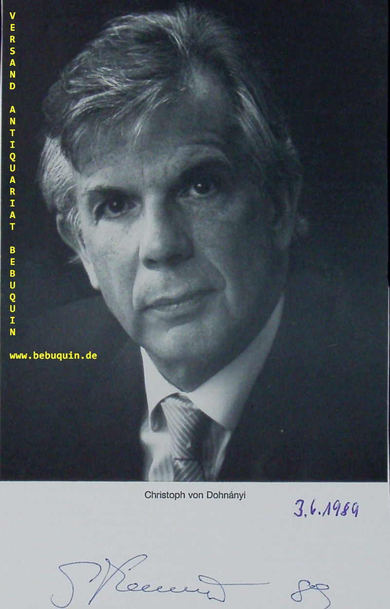 DOHNANYI, Christoph von (Dirigent): eigenhändig signiete und datierte Portraitseite. München (Junge Philharmonie), 3.6.1989. 18 x 12 cm. 1 Bl. Christoph von Dohnányi (* 8. September 1929 in Berlin) ist ein deutscher Dirigent und Intendant. (Wikipedia)
