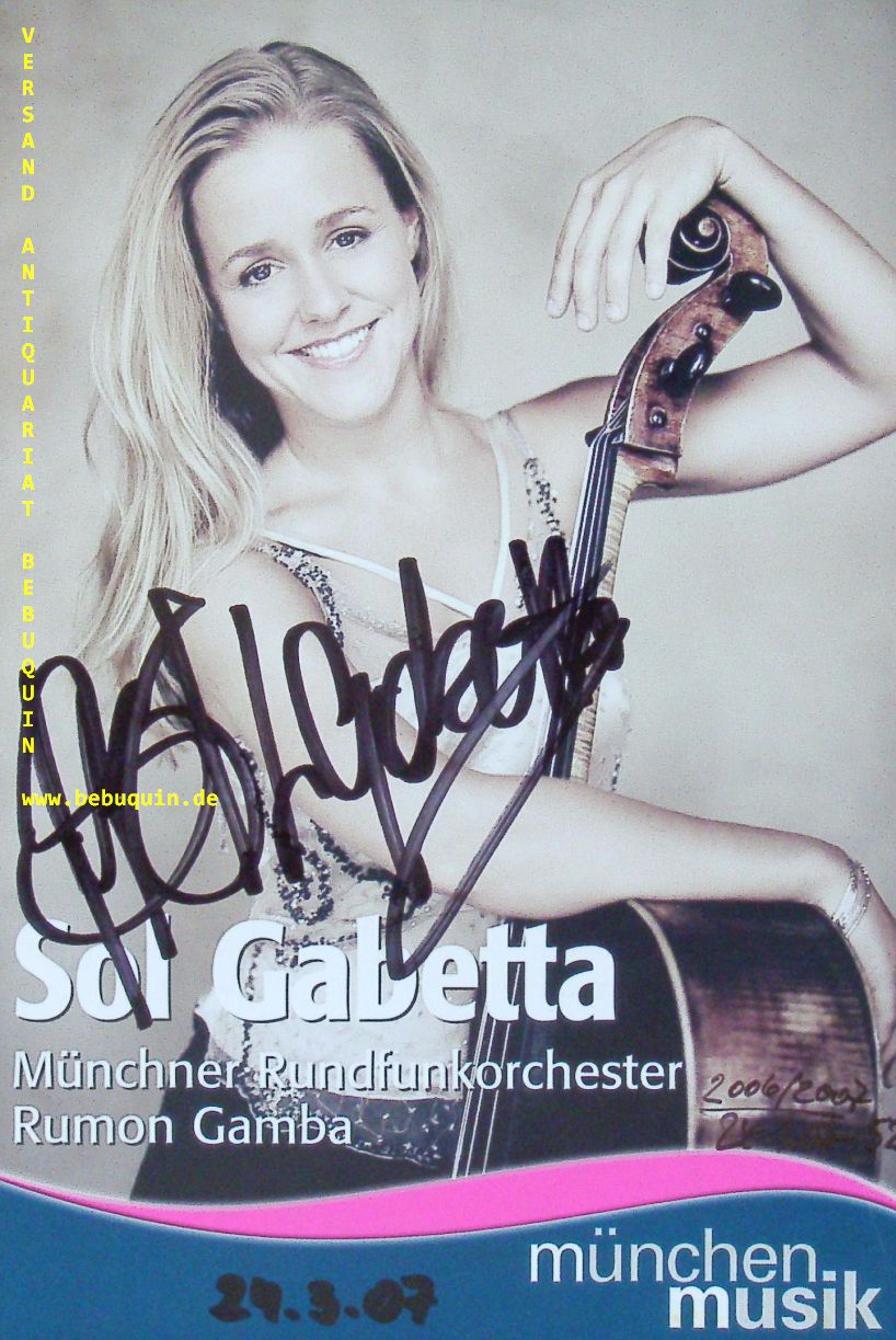 GABETTA, Sol (Cellistin): eigenhändig signierte und datierte farb. Portraitseite. München (Junge Philharmonie), 27.3.2007. 21 x 14 cm. 1 Bl. Sol Gabetta (* 18. April 1981 in Villa María, Argentinien) ist eine argentinische Cellistin. (Wikipedia)