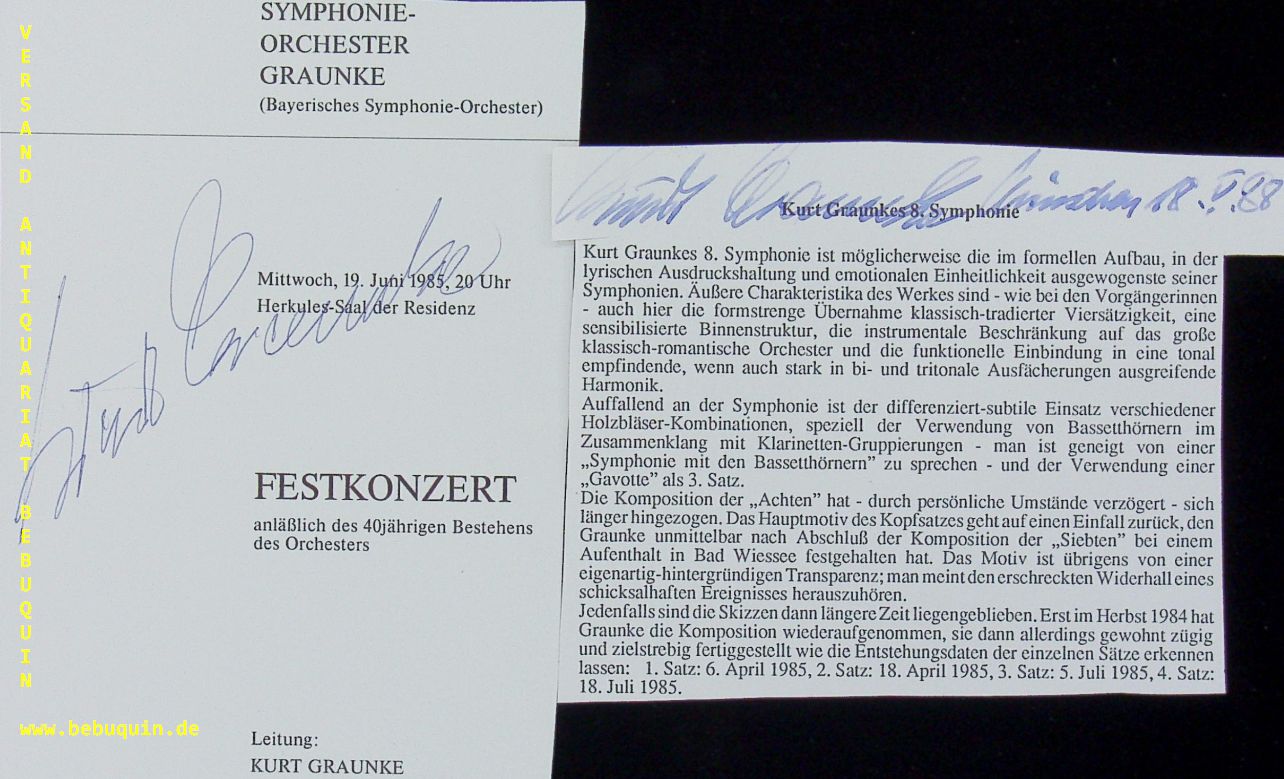 GRAUNKE, Kurt (Dirigent): 2 eigenhändig signierte und datierte Programmheftausschnitte. München (Herkulessaal), 1988. 15 x 10,5 cm. 2 Bl. Kurt Karl Wilhelm Graunke (* 20. September 1915 in Stettin; † 5. Juni 2005 in München) war ein deutscher Komponist und Dirigent sowie Gründer und Leiter des Symphonie-Orchesters Graunke, das 1990 in Münchner Symphoniker umbenannt wurde. (Wikipedia)