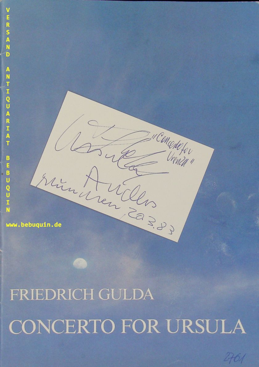 GULDA, Friedrich (Komponist) + ANDERS, Ursula (Schlagzeugerin): eigenhändig von beiden signierte und datierte Autogrammkarte. Concerto für Ursula. Sonderkonzert mit dem Berliner Kammermusikensemble. München (Hörtnagel), 20.3.1983. 8 x 12,5 cm Karteikarte + der Bildband mit Photographien von Meinrad Faltner+ dem original Programm des Konzerts. Friedrich Gulda (* 16. Mai 1930 in Wien; † 27. Jänner 2000 in Weißenbach am Attersee) war ein österreichischer Pianist und Komponist. Ursula Anders (* 6. Oktober 1938) ist eine deutsche Sängerin (Sopran) und Schlagzeugerin, die auch als Improvisationsmusikerin hervorgetreten ist. Sie stammt aus einer Musikerfamilie; ihre Eltern waren die Sänger Peter Anders und Susanne Mysz. Seit 1974 war sie die Lebensgefährtin von Friedrich Gulda. Mit ihm entwickelte sich eine intensive künstlerische Zusammenarbeit, zunächst im Bereich der freien Musik: Sie traten mit Barre Phillips und Albert Mangelsdorff ebenso auf wie mit Paul und Limpe Fuchs. Dann führte sie mit Gulda eigene Lieder-Zyklen, aber auch solche von Schubert und Schumann auf, die auch auf Schallplatte veröffentlicht wurden. 1980 komponierte Gulda für sie das Opus Anders, zwei Jahre später sein Concerto for Ursula; auch diese Werke wurden veröffentlicht. Als Nachlassverwalterin Guldas etablierte sie gemeinsam mit Heinz Preiss in Schloss Kremsegg 2003 eine Gulda gewidmete Dauerausstellung. Weiterhin ist sie als Autorin tätig; sie verfasste mit Gulda dessen Biographie und ist die Herausgeberin von Guldas Worten zur Musik und eines Gulda-Konzertverzeichnisses. (Wikipedia)