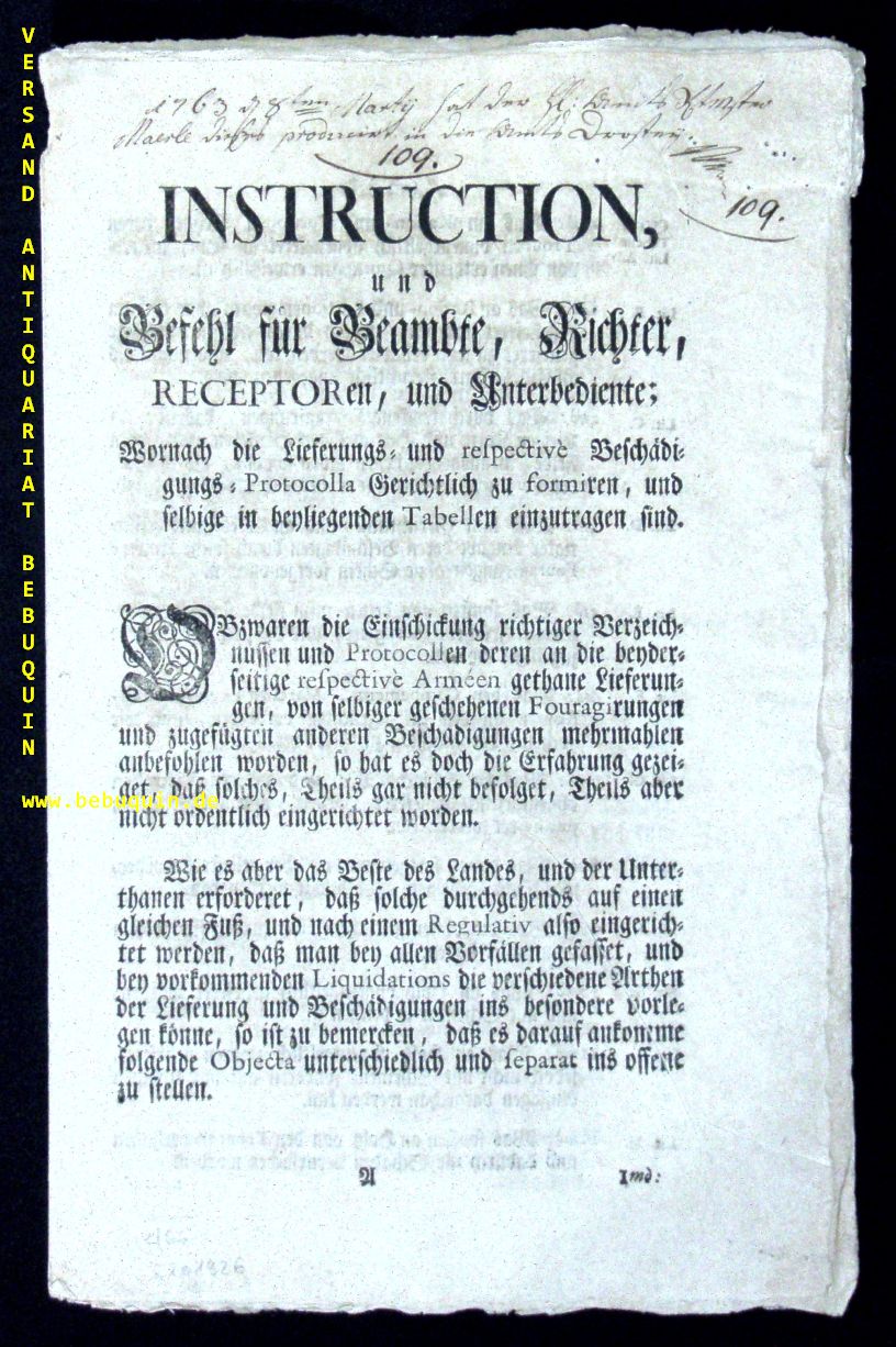 EDIKT.– KETTELER, Clemens August: Instruction und Befehl für Beambte, Richter, Receptoren und Unterbediente. „Wornach die Lieferungs- und respective Beschädigungs-Protocolla Gerichtlich zu formiren, und selbige in beyliegenden Tabellen einzutragen sind.“ Münster, 30. October 1762. 33 x 21 cm. Umfängliches Edikt mit 16 Seiten auf Hadernbütten mit gestochenen Majuskeln und LS – Zeichen. feines Ex. mit zeitgenössischem handschriftlichem Eintrag am Kopf wohl von Caspar Ferdinand Droste. Clemens August von Ketteler (* 15. Dezember 1720; † 20. März 1800) war Domherr in Münster, Worms und Osnabrück und übte im Hochstift Münster auch wichtige weltliche Ämter aus.