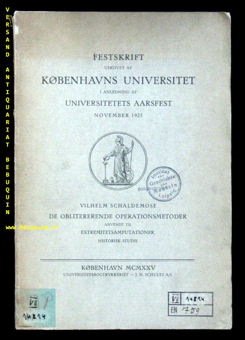 MEDIZIN.– SCHALDEMOSE, Vilhelm: De Oblitererende Operationsmetoder anvendt til Extremittetsamputationer historisk Studie. Festskrift udgivet af Kobenhavns Universitet i anledning af Universitets Aarsfest November 1925. Kopenhagen (Schultz), 1925. Gr. 8°. 140 S. mit 12 Abb. von Amputationswerkzeugen. OKart. Eine Ecke leicht gestaucht, ordnungsgemäß ausgesondertes Bibliotheksexemplar (Rückenschild, Stempel). EA. Vilhelm Schaldemose (geboren am 18. November 1866 in Kopenhagen ; gestorben am 4. Dezember 1933 ebenda) war ein dänischer Chirurg. Seit November 1906 war er Chefchirurg am Frederikskrankenhaus. Als Schaldemose als Chirurg großen Ruhm genoss, lag dies nicht nur daran, dass er ein ausgezeichneter Knochenchirurg war, sondern auch daran, dass er in Bezug auf Kropfoperationen für Dänemark das war, was Kocher für die Schweiz war, und dass er zusammen mit Professor Viggo Christiansen die Diagnose und Behandlung von Gehirntumoren mit chirurgischen Mitteln erheblich sicherer machte. (Wikipedia)