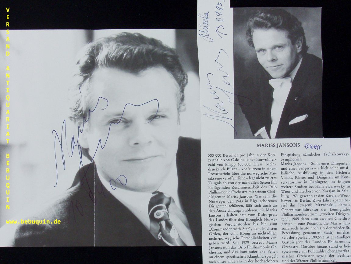 JANSONS, Mariss ( Dirigent): 2 eigenhändig signierte und datiere Portraitseiten. München (Philharmonie), 13.4.1995. 20 x 21 cm. 2 Bl. Mariss Jansons (* 14. Januar 1943 in Riga; † 1. Dezember 2019[2] in Sankt Petersburg) war ein international tätiger lettischer Dirigent. Er studierte Violine, Klavier und Dirigieren am Leningrader Konservatorium und ging 1969 nach Österreich, wo er seine Ausbildung bei Hans Swarowsky und Herbert von Karajan fortsetzte. 1973 wurde er wie sein Vater zuvor stellvertretender Dirigent der Leningrader Philharmoniker. Von 1979 bis 2000 war er Leiter des Osloer Philharmonie-Orchesters, mit dem er zahlreiche Aufführungen, Aufnahmen und Tourneen absolvierte. 1996 erlitt er während des Dirigierens von La Bohème einen lebensbedrohlichen Herzanfall auf dem Podium in Oslo, kurz darauf im Spital einen zweiten. Sein Vater war beim Dirigieren verstorben. In der Nacht zum 1. Dezember 2019 starb Mariss Jansons im Alter von 76 Jahren in St. Petersburg im Kreis seiner Familie an den Folgen einer Herzerkrankung. Die Süddeutsche Zeitung titelte in ihrem Feuilleton-Leitartikel: „Die Welt mit Klang umarmen: Der aufrichtigste, integerste, empathischste Dirigent der Welt ist tot.“ (Wikipedia)