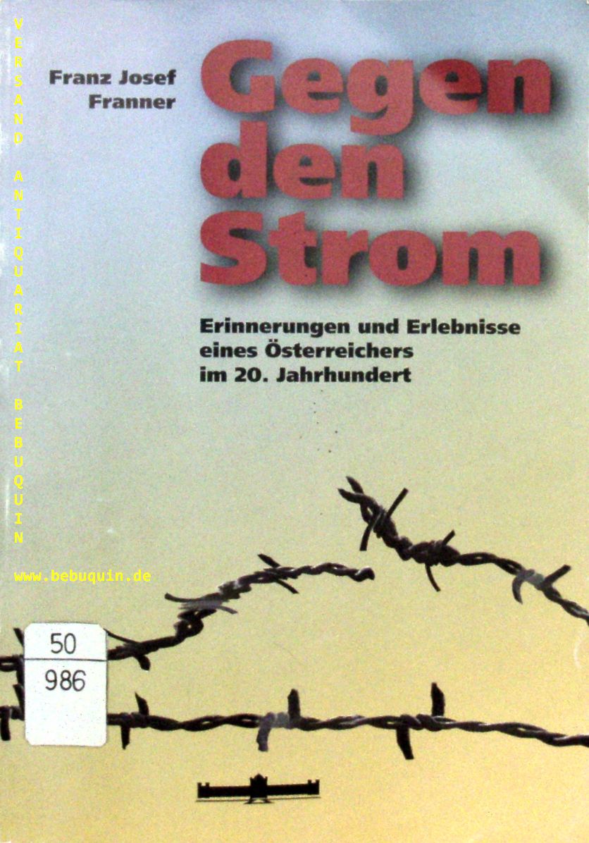 ÖSTERREICH.– FRANNER, Franz Josef: Gegen den Strom. Erinnerungen und Erlebnisse eines Österreichers im 20. Jahrhundert. Wien (Heeresgeschichtliches Museum), 1997. Gr. 8°. 182 S. mit zahlr. Abb. ill. OBr. Ordnungsgemäß aus Bundeswehrbeständen ausgesondertes Bibliotheksexemplar (Rückenschild, Stempel). seltene EA.