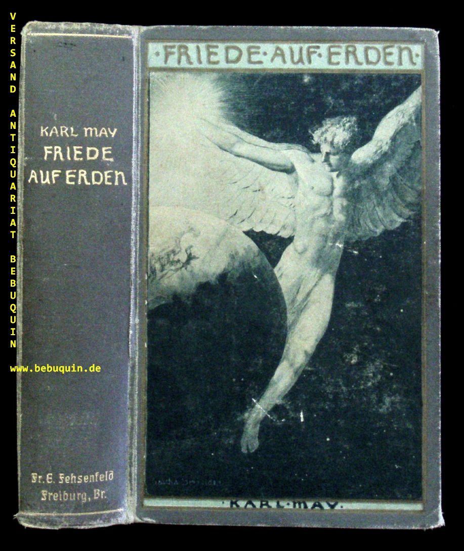MAY, Karl: Und Friede auf Erden. Reiseerzählung. 16.– 20. Aufl. Freiburg (Fehsenfeld), (1907). 660 S. graues ill. OLn. von Sascha Schneider (DB 85) mit gestalteten Vorsätzen. Einband kaum berieben, Vortitel fehlt, sonst feines Ex. mit goldenem Rücken. = Gesammelte Reiseerzählungen, Bd. XXX. letzte Fehsenfeld-Ausgabe. Plaul 373.4.