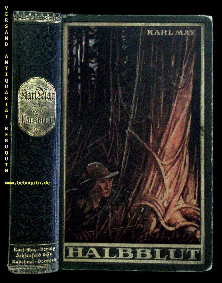 MAY, Karl: Halbblut und andere Erzählungen. Hrsg. von E. Schmid. Radebeul (Karl May), (1917). 603 (2) S. farb. ill. OHLn. mit gestalteten Vorsatzpapieren. leicht schief gelesen, Innengelenk kaum angeplatzt = Gesammelte Werke, Bd. 38. 1 von 5000 Ex. dieser seltene EA des Wild West Bandes. Hermesmeier / Schmatz GW 38.1