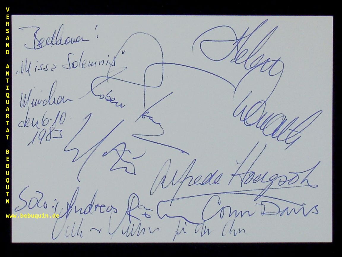 DONATH, Helen (Sopran) + DAVIS, Colin (Dirigent): eigenhändig datierte und signierte Autogrammkarte mit 6 weiteren Unterschriften. München (Herkulessaal), 6.10.1983.. 10,5 x 14,5 cm. Karteikarte. Helen Donath, geborene Helen Erwin, (* 10. Juli 1940 in Corpus Christi, Texas) ist eine US-amerikanische Opernsängerin (Sopran). (Wikipedia)