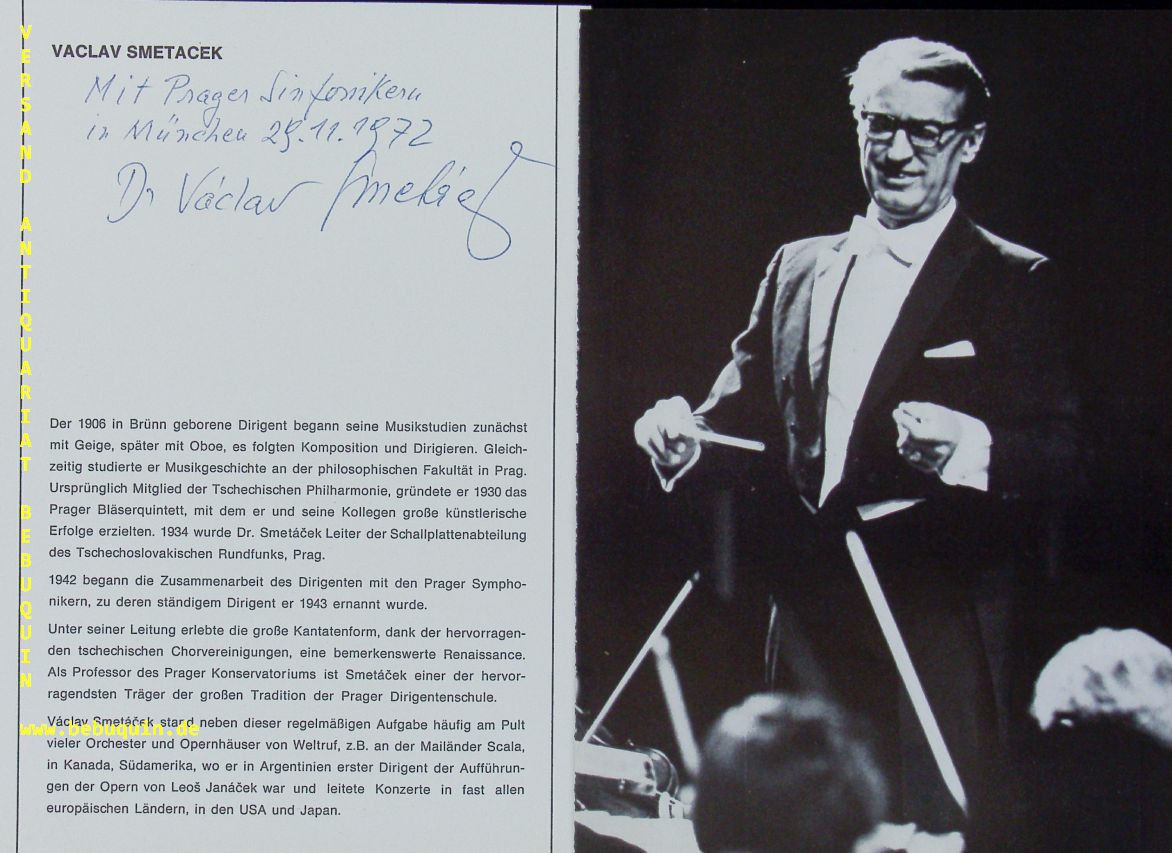 SMETACEK, Vaclav (Dirigent): eigenhändig signierte und datierte Programmseite: Mit Prager Sinfonikern. München (Philharmonie), 29.11.1972. 21 x 15 cm. 2 Bl. Václav Smetácek (* 30. Juni 1906 in Brünn; † 18. Februar 1986 in Prag) war ein tschechischer Dirigent, Komponist und Oboist. Smetácek studierte ab 1922 am Prager Konservatorium Klavier, Oboe, Musiktheorie und Orchesterleitung. Sein dortiger Oboenlehrer war Ladislav Skuhrovsky. 1928 bis 1932 folgten weitere Studien an der Prager Karlsuniversität. Mit Konservatoriumskollegen gründete er 1928 das Prager Bläserquintett, für das er auch komponierte und arrangierte, und dessen Mitglied er bis 1960 blieb. (Wikipedia)