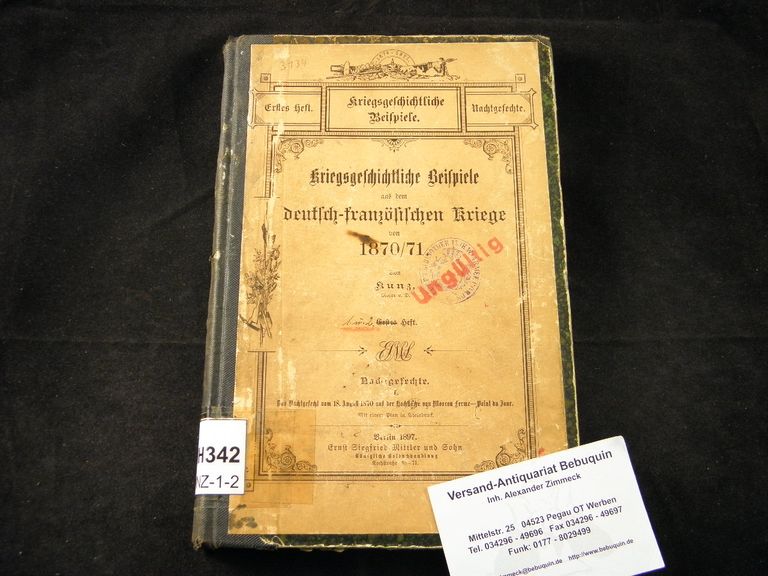 KUNZ, Major: Nachtgefechte I + II. Das Nachtgefecht vom 18. August 1870 + Die Nachtgefechte gegen die kaiserlich französische Armee. 2 Hefte in 1 Bd. Berlin (Mittler), 1897. VIII, 100, IV, 111 S. mit 2 Plänen in Steindruck + 4 Skzzen im Text. HLn der Zeit unter Verwendung des OPb. Ordnungsgemäß aus Bundeswehrbeständen ausgesondertes Bibliotheksexemplar (Rückenschild und Stempel). EA.