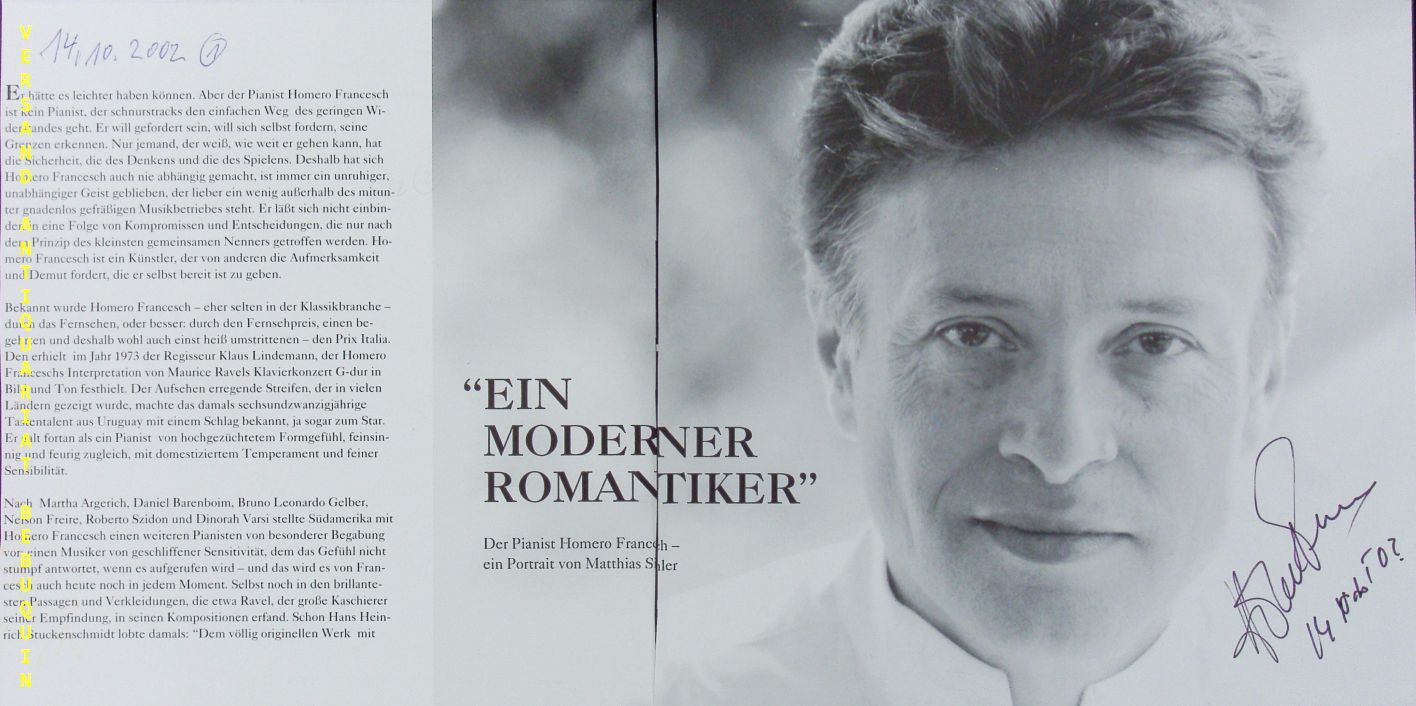 FRANCESCH, Homero (Pianist): eigenhändig signierte und datierte Portraitseite. München (Philharmonie), 14.10.2002. 20 x 21 cm. 2 Bl. Homero Francesch (* 6. Dezember 1947 in Montevideo) ist ein uruguayisch-schweizerischer Pianist. (Wikipedia)