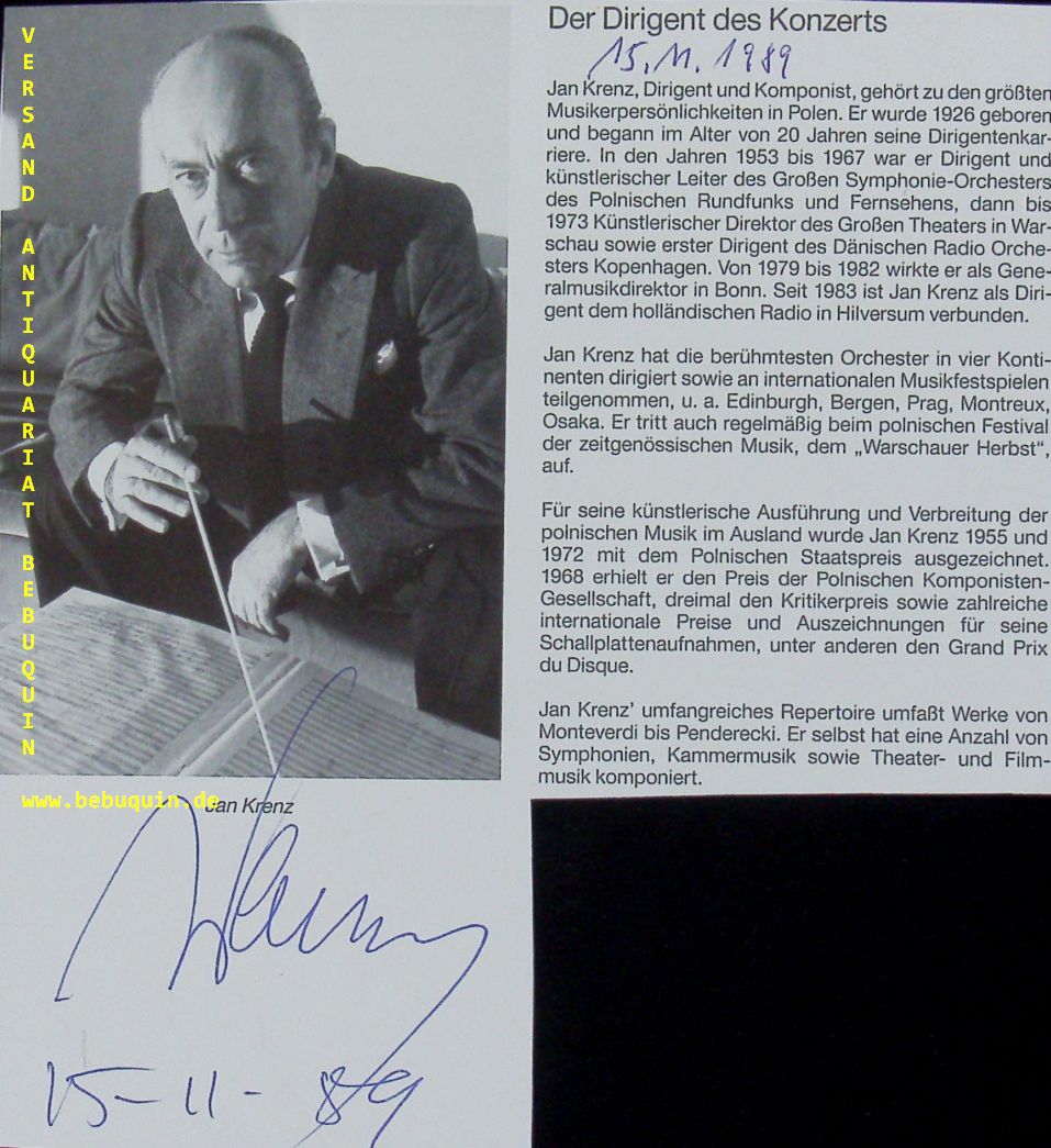 KRENZ, Jan (Dirigent): eigenhändig signierte und datierte Portraitseite. München, 15.11.1989. 18 x 17 cm. 1 Bl. Jan Krenz (* 14. Juli 1926 in Wloclawek; † 15. September 2020 in Kattowitz) war ein polnischer Dirigent und Komponist. (Wikipedia)