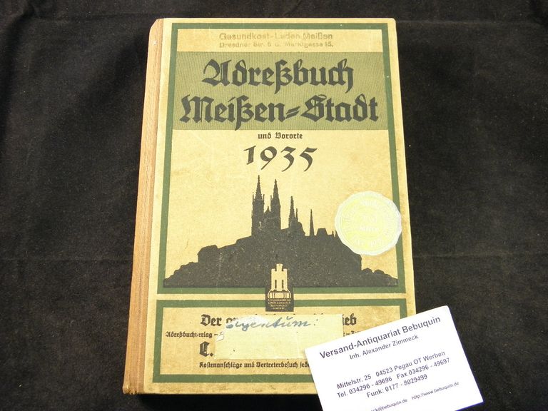 MEISSEN.– ADRESSBUCH MEISSEN – STADT 1935.– und Vororten Dobritz und Klosterhäuser. 21. Ausgabe. Meißen (Klinkicht), 1935. Gr. 8°. 602 S. mit 3 unterschiedlichen Stadtplänen und Verlagswerbung inliegend. ill. OHLn. StaU, etwas bestaubt, vorderes Gelenk gelockert, ein Stadtplan beschädigt. sehr seltenes Adressbuch.