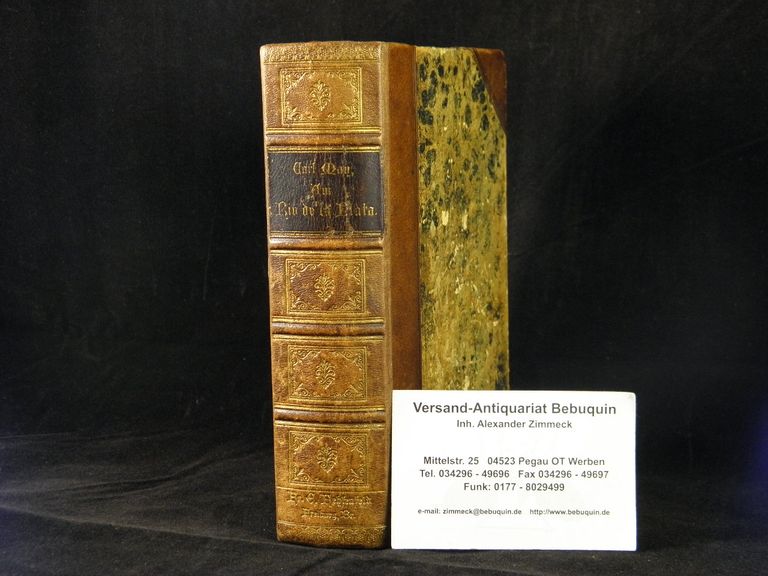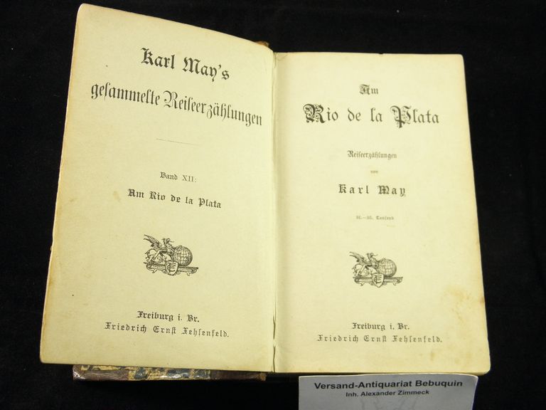 MAY, Karl: Am Rio de la Plata. Reiseerzählungen. 31.– 35. Tsd. Freiburg (Fehsenfeld), (1904). 676 (4) S. OHldr mit goldgeprägtem Rücken. kaum berieben und schief gelesen, vereinzelte Braunflecken, die letzten Seiten mit Lichtschatten, insgesamt rar und gut. = Gesammelte Reiseerzählungen, Bd. XII. Seltene Ausgabe in dem Halbleder Verlagseinband. Plaul 253.6