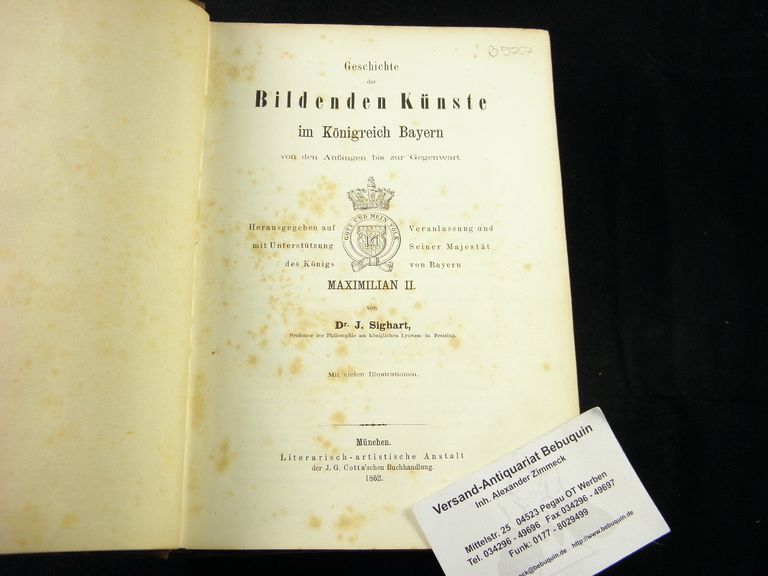 BAYERN.– SIGHART, Joachim: Geschichte der Bildenden Künste im Königreich Bayern von den Anfängen bis zur Gegenwart. Herausgegeben auf Veranlassung und mit Unterstützung Seiner Majestät des Königs von Bayern Maximilian II. München (Cotta), 1862. Gr. 8°. XII, 798 S. mit 198 teils aufklappbaren Holzstich-Illustrationen im Text und auf Tafeln. Hldr der Zeit auf 5 Bünden mit goldgeprägtem Rücken. Kanten leicht berieben, vereinzelt stockfleckig. EA. 1. Abtheilung: Die altchristliche und romanische Kunst in Bayern. 2. Abtheilung: Die Kunst der Gothik in Bayern. 3. Abtheilung: Die moderne Kunst in Bayern Sprache. Joachim Maria Sighart (* 16. Januar 1824 in Altötting; † 20. Dezember 1867 in München) war ein deutscher römisch-katholischer Theologe, Philosoph und Kunsthistoriker. (Wikipedia)