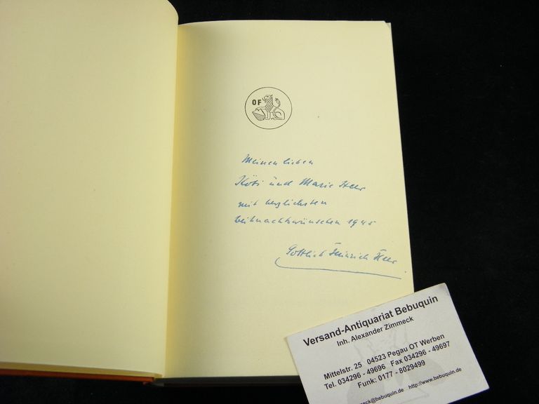HEER, Gottlieb Heinrich: Die wunderbare Flut. Eine Legende. Zürich (Orell Füssli), 1945. 203 (5) S. OLn mit goldgeprägter Deckelvignette. EA mit einer 5zeiligen handschriftlichen voll signierten und datierten Verfasserwidmung auf Vortitel. Kosch DD 876, 13.