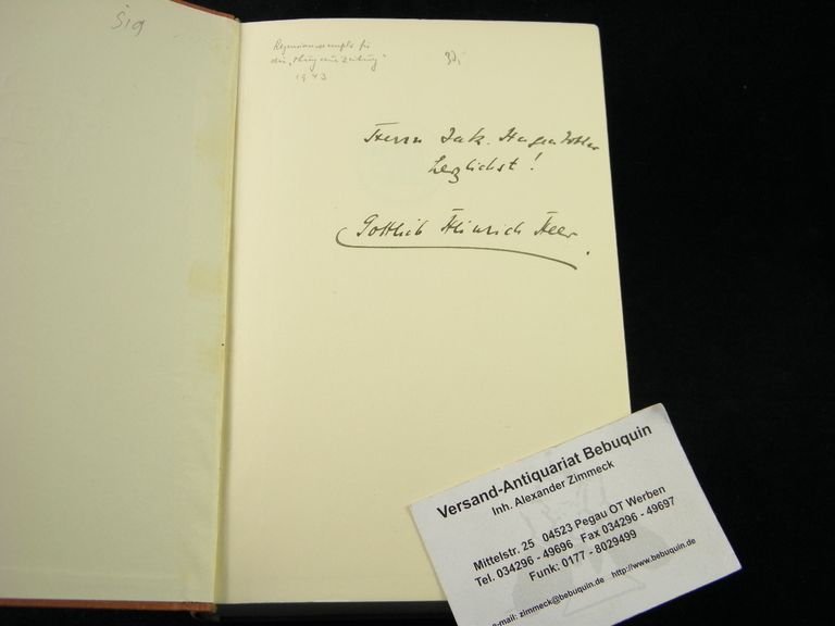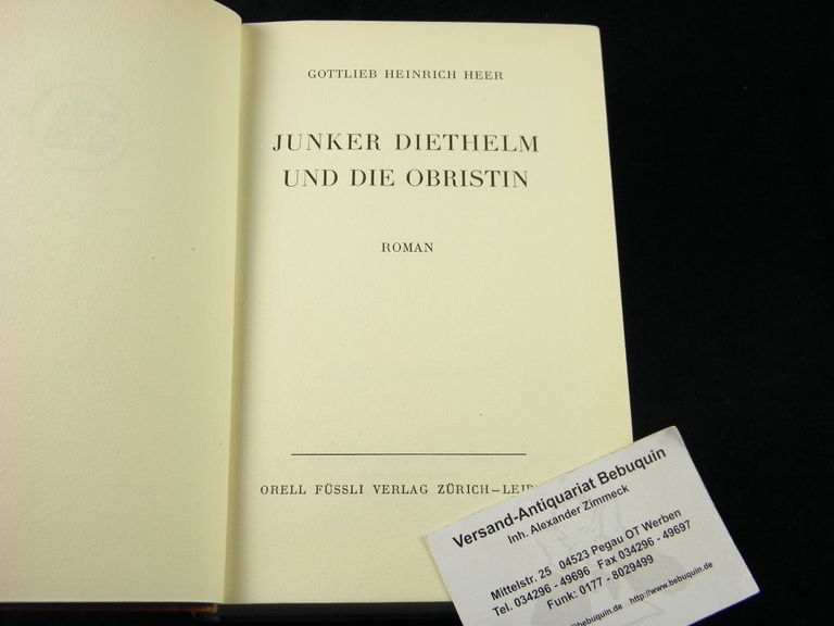 HEER, Gottlieb Heinrich: Junker Diethelm und die Obristin. Roman. Zürich (Orell Füssli), 1942. 385 (1) S. OLn mit goldgeprägter Deckelvignette. EA mit einer 3zeiligen eigenhändigen voll signierten Verfasserwidmung auf Vorsatz. Kosch DD 876, 10.