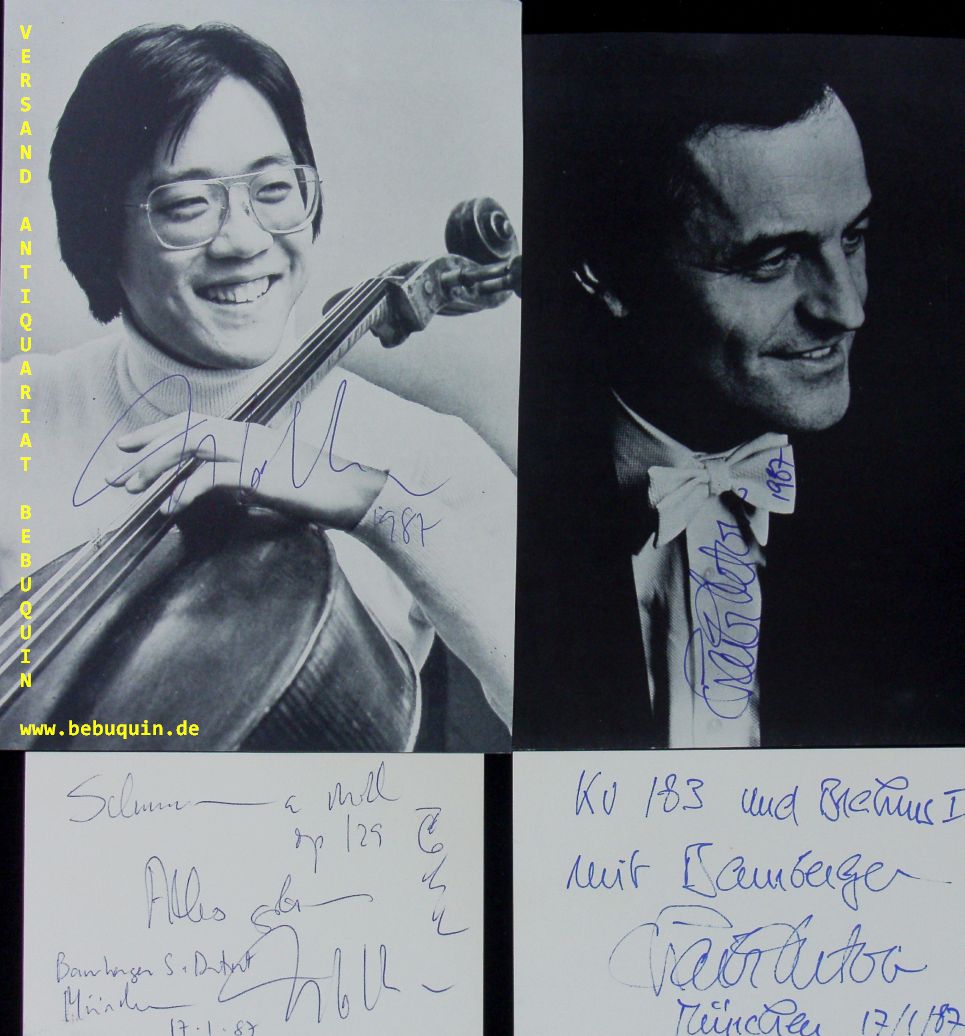 YO YO MA (Cellist) + DUTOIT, Charles (Dirigent): 2 eigenhändig signierte und datierte Autogrammkarten mit eigenhändigen Programmbeschreibungen + 2 eigenhändig signierte und datierte Portraitseiten. München, 17.1987. 21 x 14 cm. 2 Karteikarten + 2 Bl. 12 S. mit zahlr. Abb. OKart. tadellos = Winderstein Konzerte. Yo-Yo Ma (* 7. Oktober 1955 in Paris) ist ein US-amerikanischer Cellist. Seine Diskografie umfasst mehr als 100 Alben, die ihm 19 Grammys einbrachten (Stand 2020). (Wikipedia)