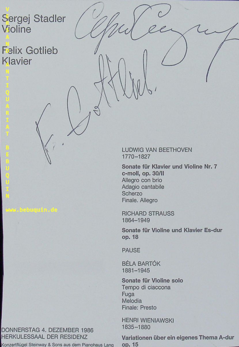 STADLER, Sergej (Violinist) + GOTLIEB, Felix (Klavier): eigenhändig von beiden signierte Programmseite. München (Philharmonie), 4.12.1986. 19,5 x 13 cm. 1 Bl. Sergei Stadler is a Russian violinist and conductor. He is currently Artistic Director and Chief Conductor of the Saint Petersburg Symphony Orchestra. (Wikipedia)