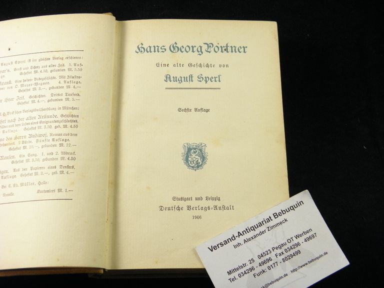 SPERL, August: Hans Georg Portner. Eine alte Geschichte. 6. Aufl. Stuttgart (DVA), 1906. 402 (5) S. OLn. stärker gebräunt, mittig gelockert, es fehlen die Seiten 213 – 220. Eigenhändige voll signierte und datierte Verfasserwidmung an „die liebe Tante Julie Sperl“. Von dieser kaum sechs Monate später ebenfalls auf dem fliegenden Vorsatz gewidmet an Elfriede Mergner mit der Signatur „Tante Julie“.