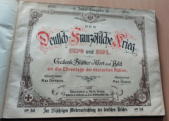 MAY.– DITTRICH, Max: Der Deutsch-Französische Krieg 1870 und 1871. Dresden (Münchmeyer), 1889. 44 x 56 cm. 1 Bl., 86 S. mit 26 (davon 24 farb.) lithogr. Tafeln in Öldruck von Max Henze sowie zahlr. Textholzst. Oln. mit Blind- und Schwarzprägung in OSchuber. fliegende Vorsätze lose und lädiert, Schuber stärker lädiert, kleiner Braunfleck am unteren Schnitt, sonst von feinster farbstarker Erhaltung mit nahezu jungfräulichen Farbtafeln. EA mit allen Tafeln. Die Tafeln ganz im Stile eines Volksbuches in kräftigen Farben gehalten, zeigen die wichtigsten Schlachten des Krieges meist mit Hintergrundansichten: Erstürmung des Gaisberges./ Reiterangriff bei Reichshofen. / Angriff d. franz. Cürassire bei Morsbrunn./ Erstürmung der Spicherer Höhen./ Reitergefecht bei Buzancy./ Waldkampf bei Sedan./ Reiterangriff bei Sedan./ Schlacht bei Artenay. / Erstürmung von Orleans./ Gefecht bei Raon l’ Etape./ Erstürmung von Chateaudun./ Erstürmung von Le Bourget./ Beschiessung von Strassburg./ Schlacht bei Champigny./ Schlacht bei Monbeliard./ Schlacht bei St. Quentin./ Uebergang Bourbaki’s in die Schweiz./ Truppeneinzug in Dresden am 11. Juli 1871 (ganzseitiger Holzstich)./ Das Nationaldenkmal auf dem Niederwald. (s/w) / Einzug in Berlin (s/w)./ König Wilhelm von Preussen u. sein Generalstab (s/w)./ Schlacht bei Beaumont./ Reitergefecht bei Mars la Tour./ König Wilhelm bei Rezonville./ Sturm auf St. Privat./ Uebergabe von Metz./ Erstürmung von Dijon./ Einzug in Paris am 1. März 1871. Der Freund und Knastkumpan Karl Mays, Julius Eduard Maximilian Dittrich (10.6.1844 – 10.5.1917) war Hauslehrer, Journalist und ab 1870 Redakteur verschiedener Zeitungen in Dresden. Da der frühere kaufmännische Angestellte vom 13.7.1866 – 13.1.1868 wegen Betrugs und Unterschlagung in Schloss Osterstein inhaftiert war, kannten sich May und Dittrich vermutlich bereits aus dieser Zeit. (May sass ab 14.6.1865 ebendort ein.) Da Dittrich zur selben Zeit wie May in Schloss Osterstein war, kannten sie sich vermutlich bereits aus dieser Zeit. Dittrich erklärte dazu am 25. November 1908: „Es ist richtig, daß ich May das erste Mal in Schloß Osterstein in Zwickau gesehen habe, und zwar im Jahre 1866. Gesprochen habe ich ihn damals aber nicht.″