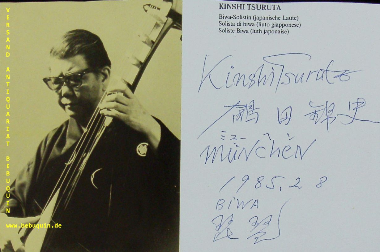TSURUTA, Kinshi (Biwa-Solistiin): eigenhändig zweisprachig signierte und datierte Portraitseite. München (Philharmonie), 2.8.1985. 22 x 18 cm. 1 Bl. Kinshi Tsuruta (15.8.1911 – 4.4.1995) was an eminent Japanese musician of the 20th century. (Wikipedia)