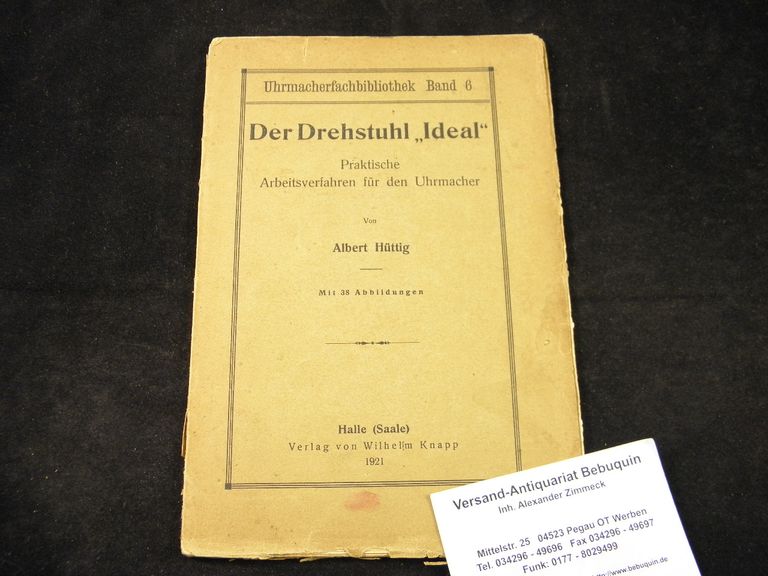 UHREN.– HÜTTIG, Albert: Der Drehstuhl „Ideal“. Praktische Arbeitsverfahren für den Uhrmacher. halle (Knapp), 1921. 37 (3) mit 38 Abb. OKart. Rücken eingerissen. = Uhrmacherfachbibliothek, Bd. 6. EA.