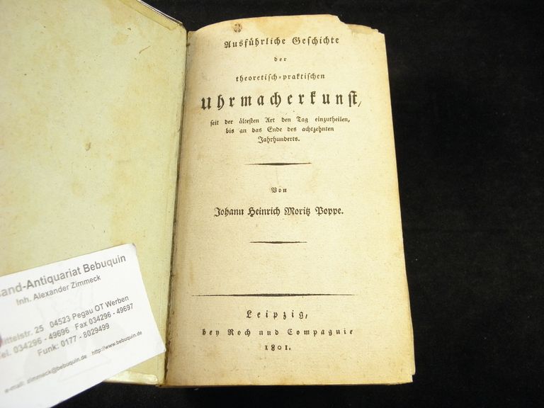 UHREN.– POPPE, Johann Heinrich Moritz: Ausführliche Geschichte der theoretisch-praktischen Uhrmacherkunst, seit der ältesten Art den Tag einzutheilen, bis an das Ende des achtzehnten Jahrhunderts. Leipzig (Roch), 1801. X, 564 (1) S. fol. Pb der Zeit. wenig braunfleckig und gelockert, es fehlt das Blatt mit Seiten 3/4. Zwei seltene EA in einem Band. Angebunden der Titel von Johann Heinrich Moritz Poppe: Ausführliche Geschichte der Anwendung aller krummen Linien in mechanischen Künsten und in der Architektur, seit den ältesten Zeiten bis zu Anfange des neunzehnten Jahrhunderts. Nürnberg (Raspe), 1802. XVI, 223 S. „Diese Monographie, die ihrem Autor u. a. auch die Würde eines schwarzburg-sondershausischen Rathes eintrug, ist dem Fürsten Primas gewidmet, der denn auch die Dedication annahm, in einem uns noch erhaltenen Briefe aber in feinsinniger Weise den Verfasser auf die Mängel hinwies, welche dessen Behandlung des Gegenstandes nach anhafteten. Auch die um eben diese Zeit entstandene „Ausführliche Geschichte der theoretisch-praktischen Uhrmacherkunst“ darf als eine gediegene Arbeit gelten. 1803 promovirte P., habilitirte sich bald darauf an der heimischen Hochschule und hielt vor einem großen Auditorium Vorträge über mathematische Geographie.“ (Deutsche Biographie) Johann Heinrich Moritz von Poppe (* 16. Januar 1776 in Göttingen; † 21. Februar 1854 in Tübingen) war ein deutscher Mathematiker und Physiker. Seit seiner Jugend beschäftigte er sich intensiv mit der Uhrmacherkunst und gehörte zu den ersten Autoren, die sich mit praktischen Fragen des Rettungswesens und der Unfallverhütung auseinandersetzten. (Wikipedia)