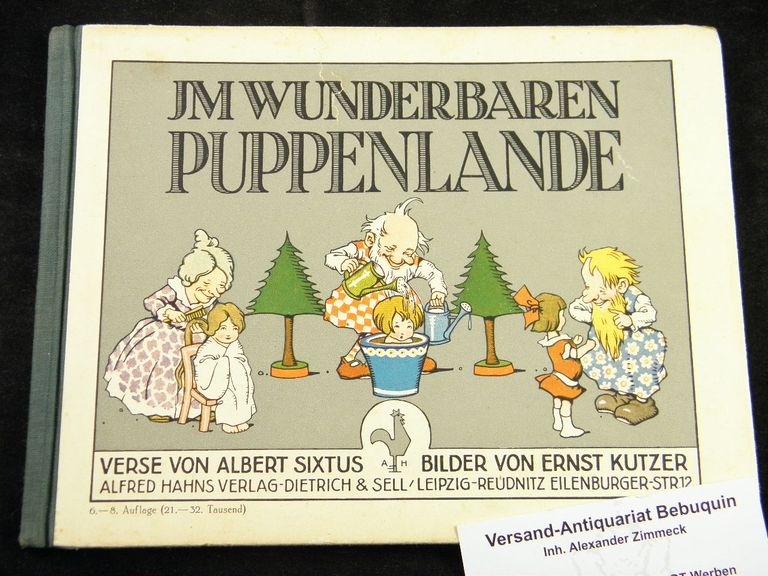 KUTZER.– SIXTUS, Albert: Im wunderbaren Puppenlande. 6.– 8. Aufl. Leipzig (Hahn, Dietrich & Sell), (1930). Quer 8°. 15 Bl. mit 15 farb. Tafeln und zahlr. Textabb. farb. ill. OHLn. StaV, WaT, feines Ex. = Verlagsnummmer 44. (Sixtus = Knebel; Kutzer = Klotz 6857/53 irrig).