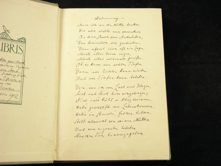 DÖRFLER, Peter: Als Mutter noch lebte. Aus einer Kindheit. 2.+ 3. Aufl. Freiburg (Herder), 1912. 285 (2) S. ill. OLn. Mit einem 28zeiligen eigenhändigen signierten Verfassergedicht auf Vorsatz. “. . . Hab’s in Stunden frohen, bittern, / still erlauscht von meinen Müttern / und von eigenstem Erleben / manchen Ton hinzugegeben . . . „ Wohl ein textliches Unikat. Peter Dörfler (* 29. April 1878 in Untergermaringen; † 10. November 1955 in München) war ein deutscher katholischer Priester, Erzieher und Dichter. (Wikipedia)