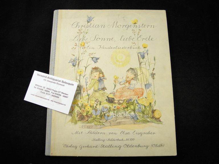 EISGRUBER.– MORGENSTERN, Christian: Liebe Sonne, liebe Erde. Ein Kinderbilderbuch. Oldenburg (Stalling), (1943). 4°. 12 Bl. mit bunten Bildern von Elsa Eisgruber. farb. ill. OHLn. leicht bestaubt, NaT. EA dieses bis heute immer wieder aufgelegten Kinderbuchklassikers. Doderer 342.