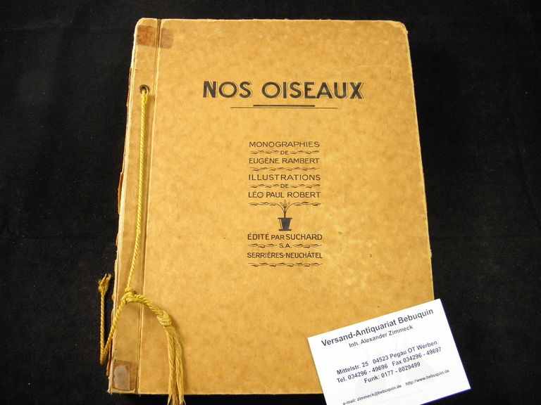 ORNITHOLOGIE.– RAMBERT, Eugene: Nos Oiseaux. 48 Monographies d’Oiseaux. Preface et Biographies du Alfred Mayor. Neuchatel (Suchard), (1930). Gr. 8°. 200 S. mit 48 Reproductions d’Aquarelles du Peintre L.P. Robert. OKart mit Kordelbindung. Rücken teils abgerieben, innen gut. möglicherweise ein Sammelbilderalbum.