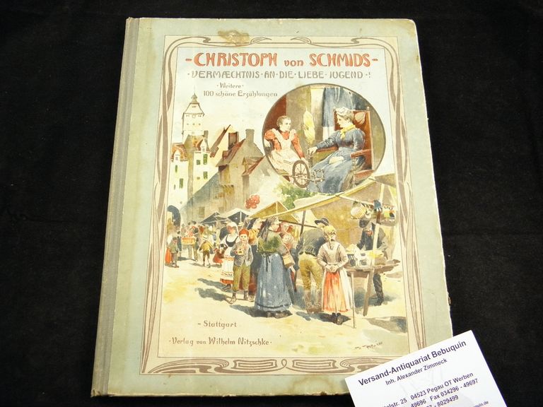 SCHMID, Christioph von: Vermächtnis an die liebe Jugend ! Weitere 100 schöne, lehrreiche Erzählungen. Für Knaben und Mädchen mittleren Alters. Stuttgart (Nitzsche), (1901). 4°. 48 S. m it zahlr. Text-Illustrationen + 3 Farbendruckbildern v on Wilhelm Hoffmann, F. Lipps und C. Schmauk. farb. ill. OHLn . Einband etwas angeschmutzt, sonst gut erhalten. EA Klotz 6354/858.