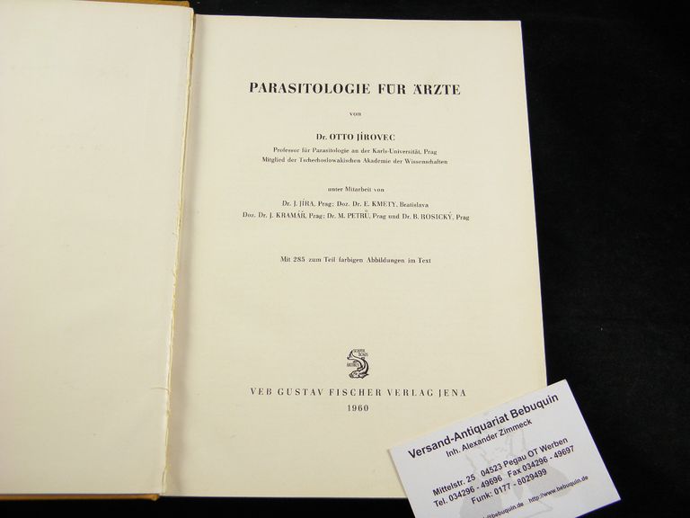PARASITOLOGIE.– JÍROVEC, Otto: Parasitologie für Ärzte. Mitarbeit von Jíra, Kmety, Kramár, Petru, Rosický. A. d. Tschechischen. Jena (Fischer), 1960. Gr. 8°. XI, 684 S. mit 285 teils farb. Abb. fol. OLn. Gelenke angeplatzt. dt. EA. Otto Jírovec (* 31. Januar 1907 in Prag; † 7. März 1972 ebenda) war ein tschechischer Mikrobiologe, nach dem der Erreger Pneumocystis jirovecii benannt ist. (Wikipedia)