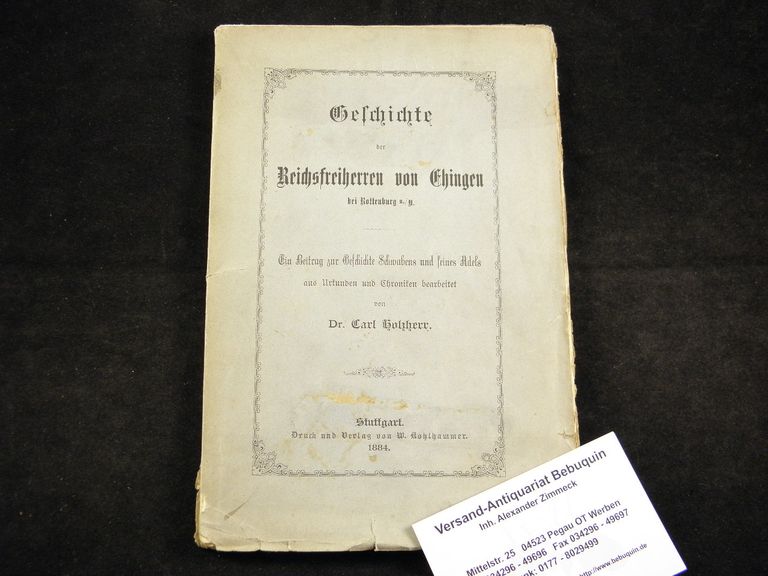 SCHWABEN.– HOLZHERR, Carl: Geschichte der Reichsfreiherren von Ehingen bei Rottenburg. Ein Beitrag zur Geschichte Schwabens und seines Adels aus Urkunden und Chroniken bearb. Stuttgart (Kohlhammer), 1884. VII, 164 S. ill. OBr. unaufgeschnitten. EA.