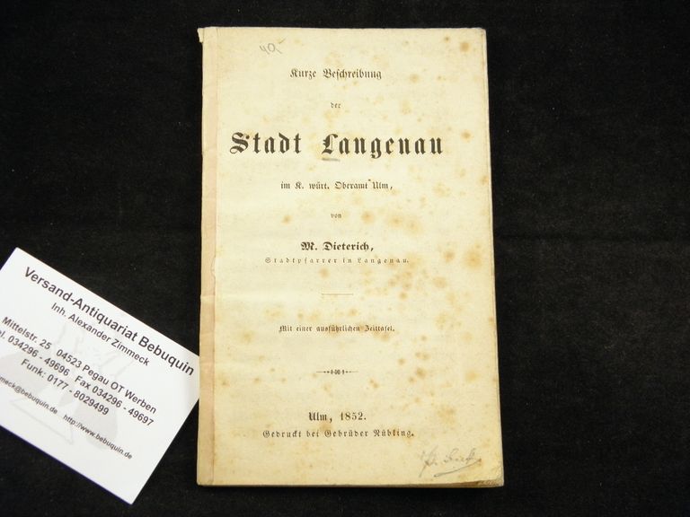 LANGENAU.– DIETERICH, M(ichael): Kurze Beschreibung der Stadt Langenau im K. Würt. Oberamt Ulm. Ulm (Nüdling), 1852. kl 8°. 75 S. mit einer ausführlichen Zeittafel. Interimseinband. teils etwas stockfleckig. EA.