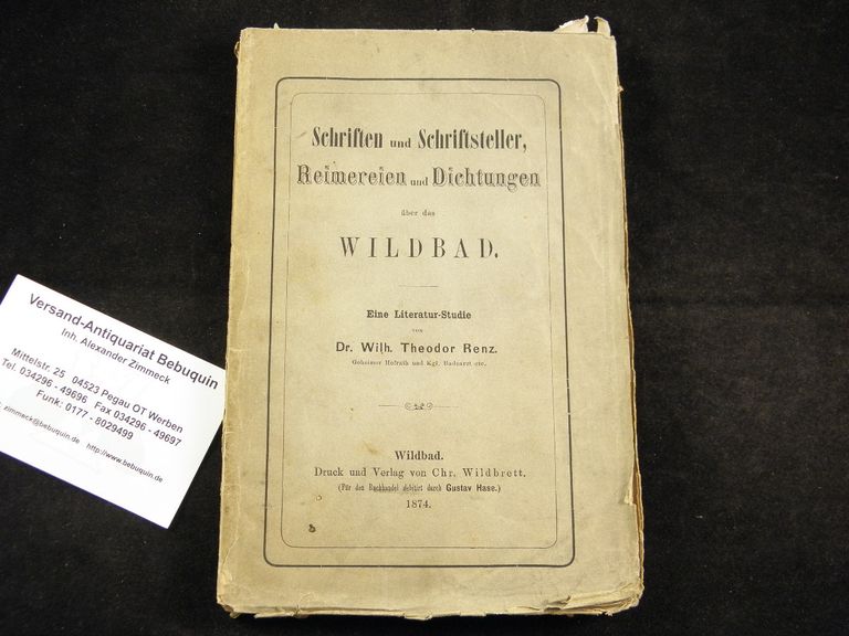 WILDBAD.– RENZ, Wilhelm Theodor: Schriften und Schriftsteller, Reimereien und Dichtungen über das Wildbad. Eine Literatur-Studie. Wildbad (Wildbrett), 1874. VI (1) S., 103 (1) S. Mit 1 Porträt von Justinus Kerner in Holzstich. OBr. bestaubt, Kanten unbeschnitten. EA. Wilhelm Theodor Renz, ab 1874 von Renz, (* 10. Januar 1834 in Oberdischingen; † 30. Dezember 1896 in Wildbad) war ein deutscher Mediziner und Königlicher Badearzt in Wildbad. (Wikipedia)