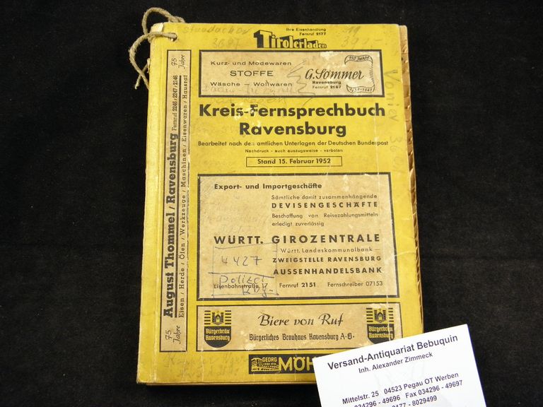 RAVENSBURG.– KREIS-FERNSPRECHBUCH RAVENSBURG 1952.– Stand 15. Februar 1952. Stuttgart (Straubinger), 1952. 162 S. alphabetischen Griffmulden. ill. OKart. Einband angeschmutzt und bekritzelt, mit Hängeband, deutliche Gebrauchsspuren. Seltenes Telefonbuch.