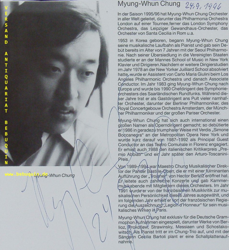 CHUNG, Myung Whun (Dirigent): eigenhändig signierte und datierte Portraitseite. München, 24.9.1996. 18 x 16,5 cm. 1 Blatt. Chung Myung-whun (* 22. Januar 1953 in Seoul) ist ein südkoreanischer Dirigent und Pianist. (Wikipedia)