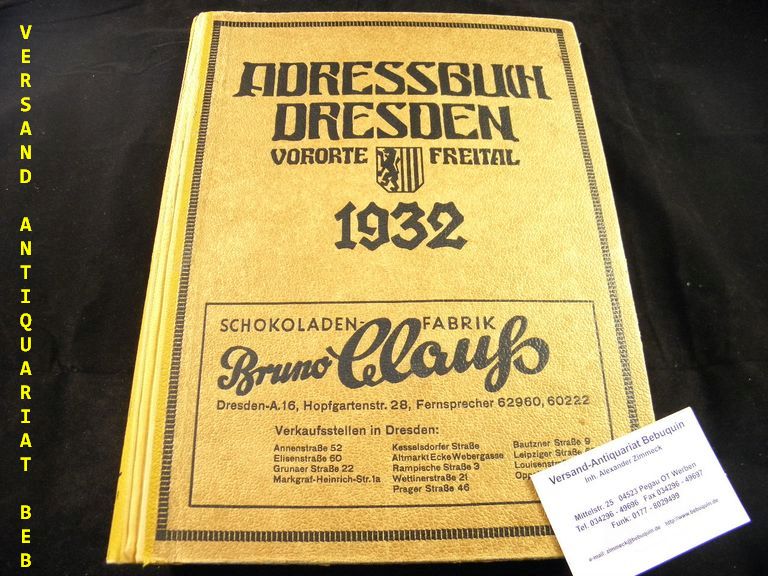 DRESDEN.– ADRESSBUCH FÜR DRESDEN UND VORORTE 1932.– Boxdorf, Cossebaude, Coßmannsdorf, Dölzschen, Gittersee, Gohlis, Hainsberg, Hosterwitz, Klotzsche-Königswald, Langebrück, Lausa, Mobschatz, Moritzburg, Niederpoyritz, Niedersedlitz, Oberlößnitz, Pesterwitz, Pillnitz, Rähnitz-Hellerau, Reichenberg, Schönfeld, Wahnsdorf, Wilschdorf, Zschachwitz und Zschieren sowie der Städte Dohna, Freital, Heidenau, Klotzsche, Rabenau, Radebeul, Tharandt und Wilsdruff. Dresden (Güntzsche Stiftung), 1932. 4°. XVI, 12, 920, 825, 194, 54, 92, 66, 107, 121 S. mit zahlr. Bildtafeln. ill. OHLdr. gutes Ex. Sehr seltenes Adressbuch.